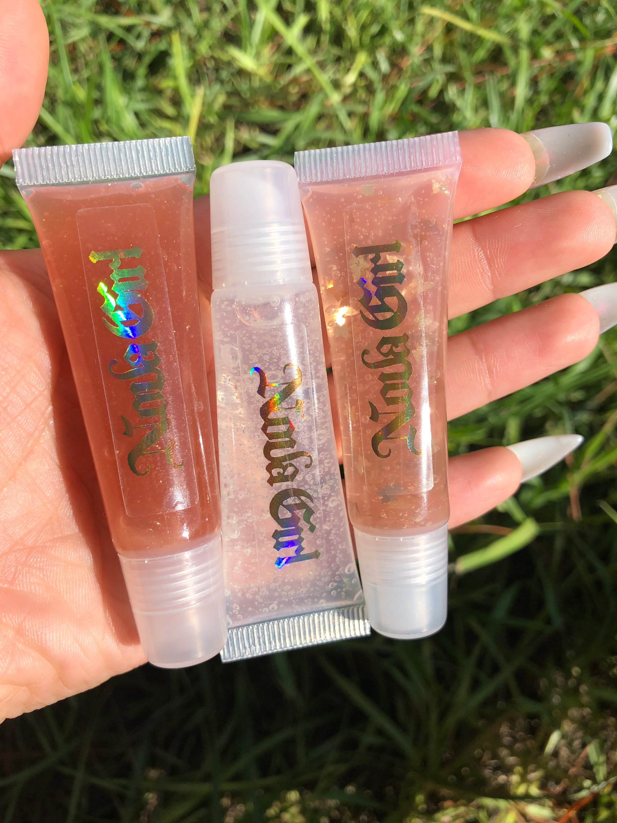 Handmade lipgloss with coconut oil (left to right) -Amber, coconut scented -Clear -Almond, with gold butterflies